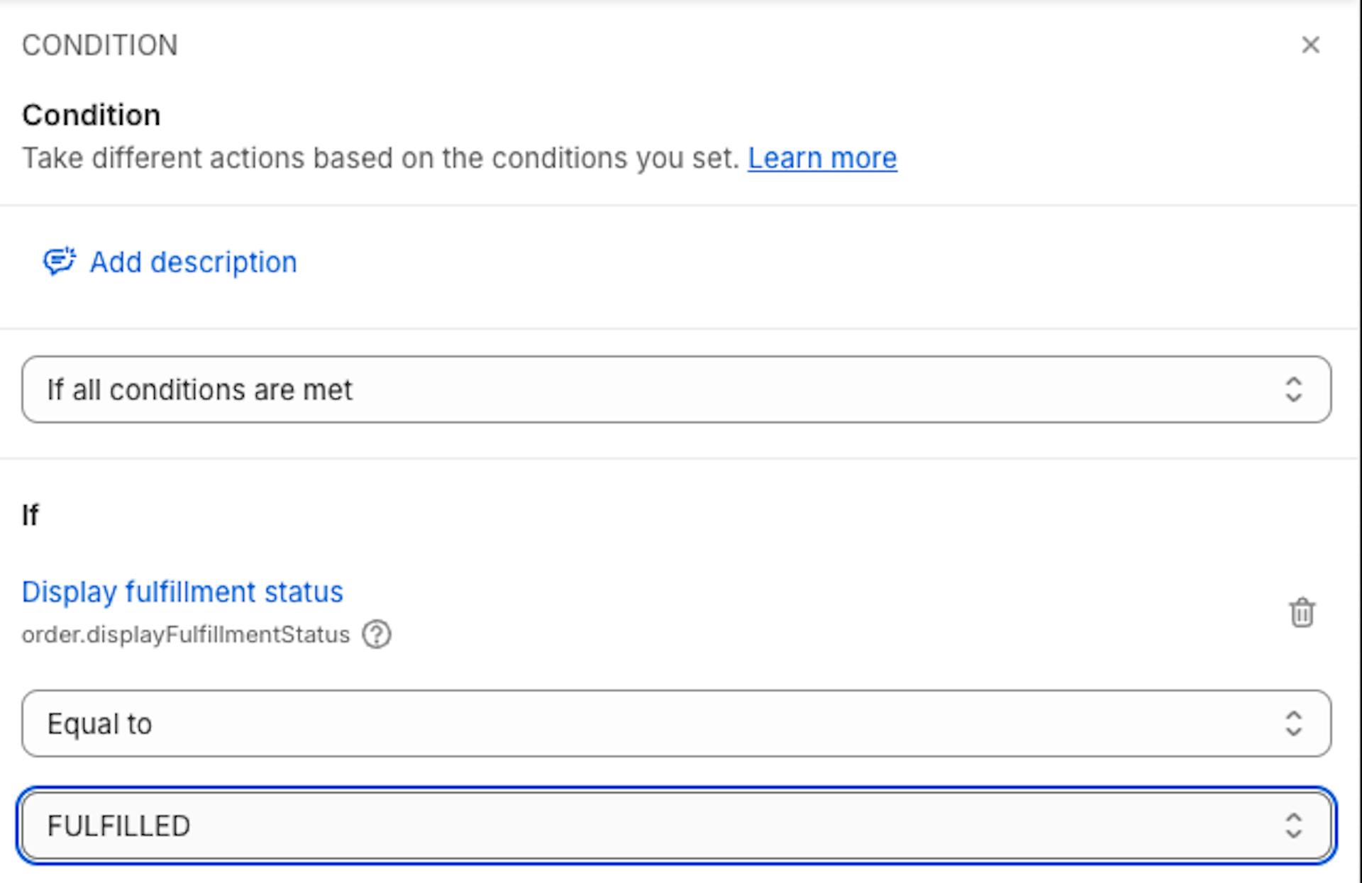 If you'd like to collect the remaining balance on first fulfillment for your Shopify deposit orders, simply don't add this condition to your workflow.