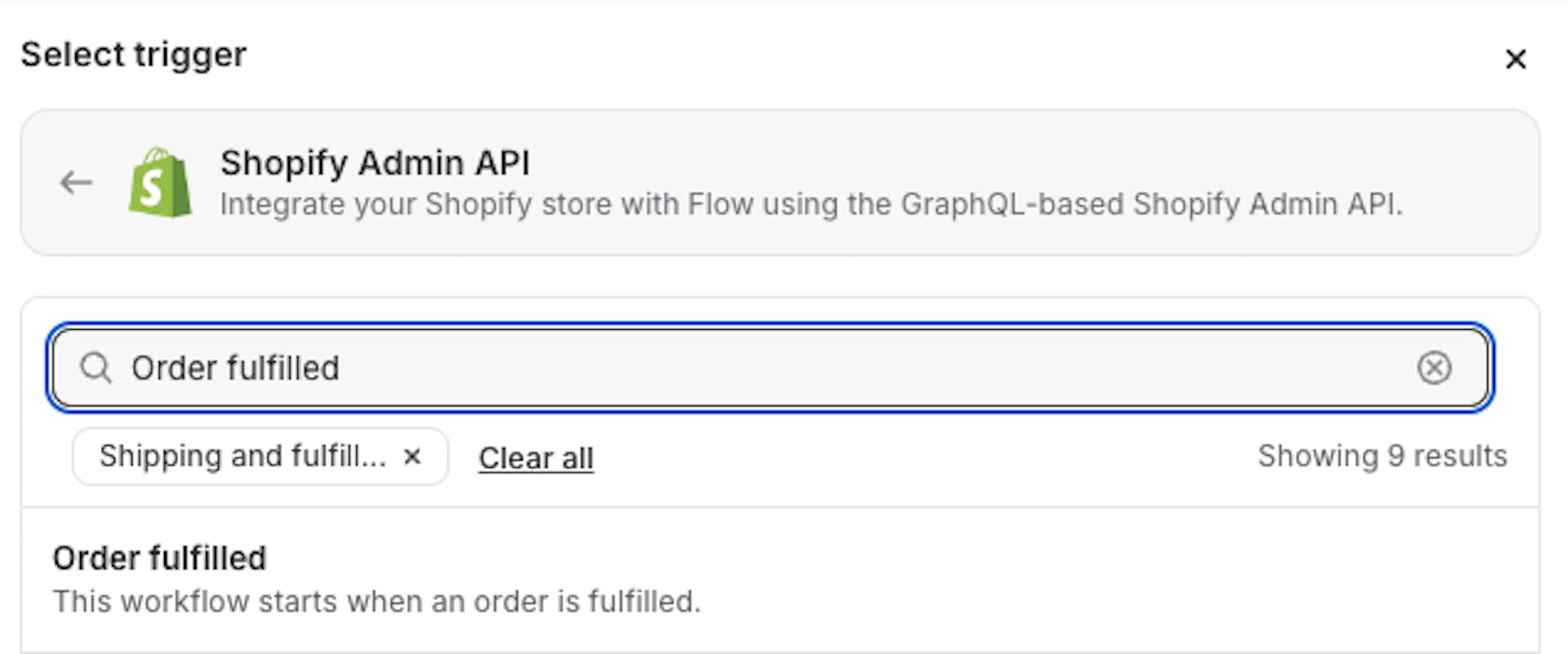 This trigger can be found in the Shopify Admin API menu in the Shipping and Fulfillment category.