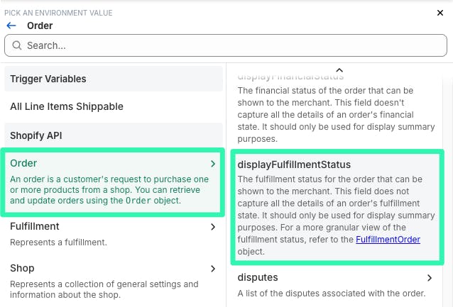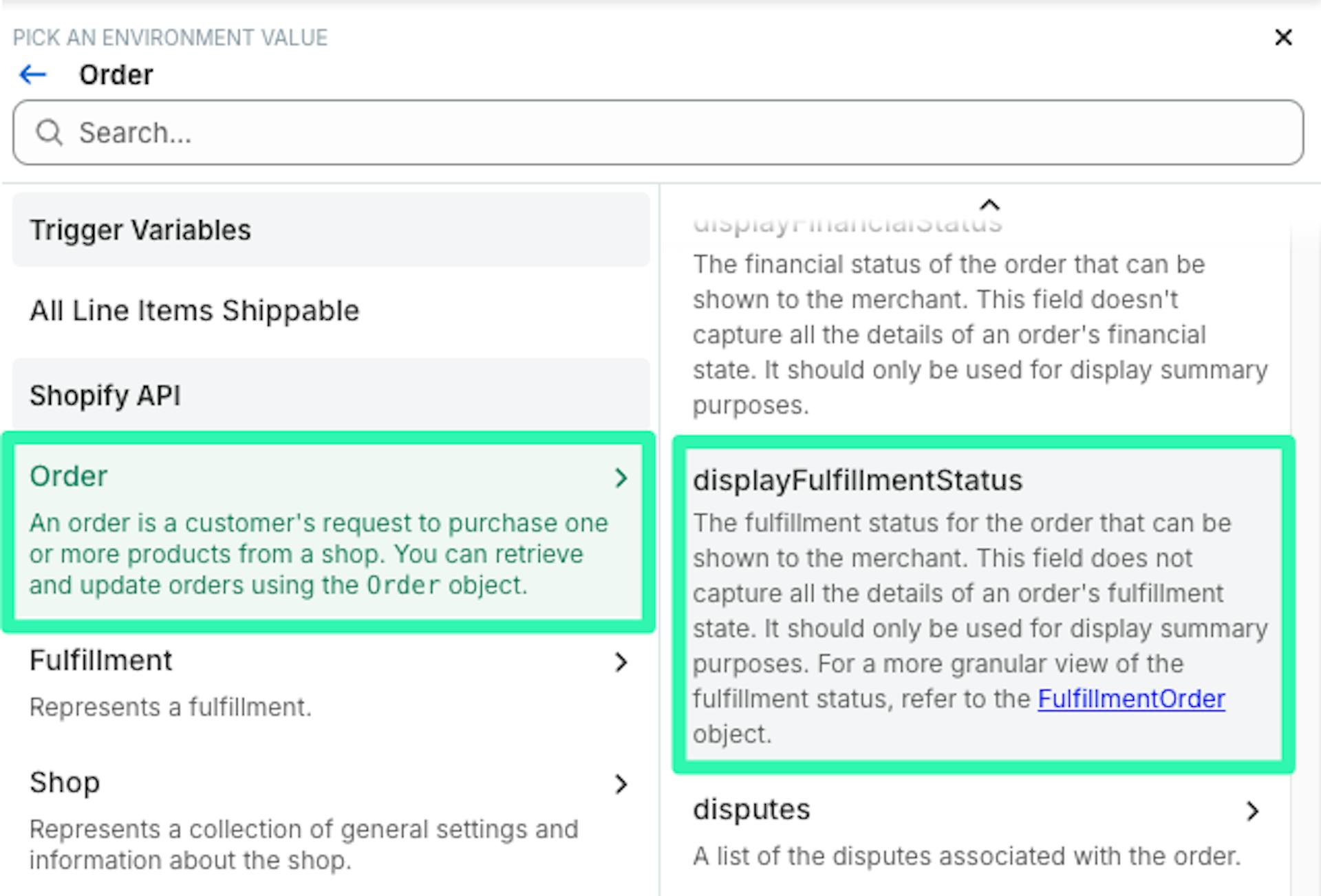 3. Navigate to the the Shopify API menu under Order and select displayFulfillmentStatus.