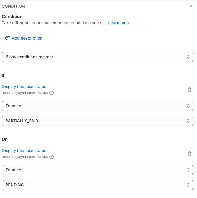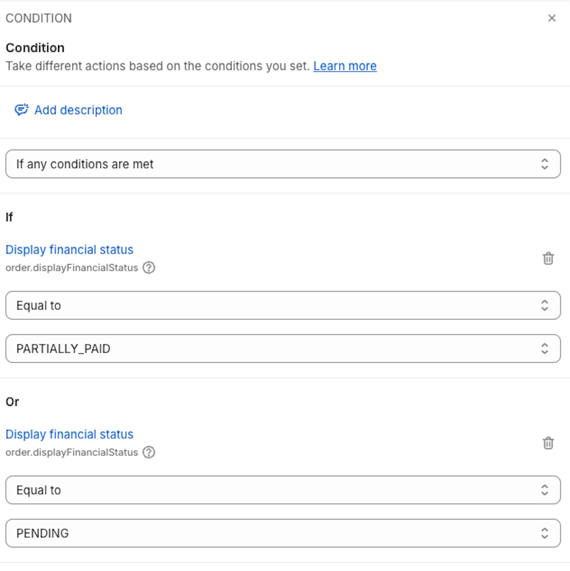 Our next condition will be to determine if the order has the payment status of partially paid or pending payment. These two statuses are common when using Downpay to enable your Shopify preorder campaigns or partial payment selling strategies.
