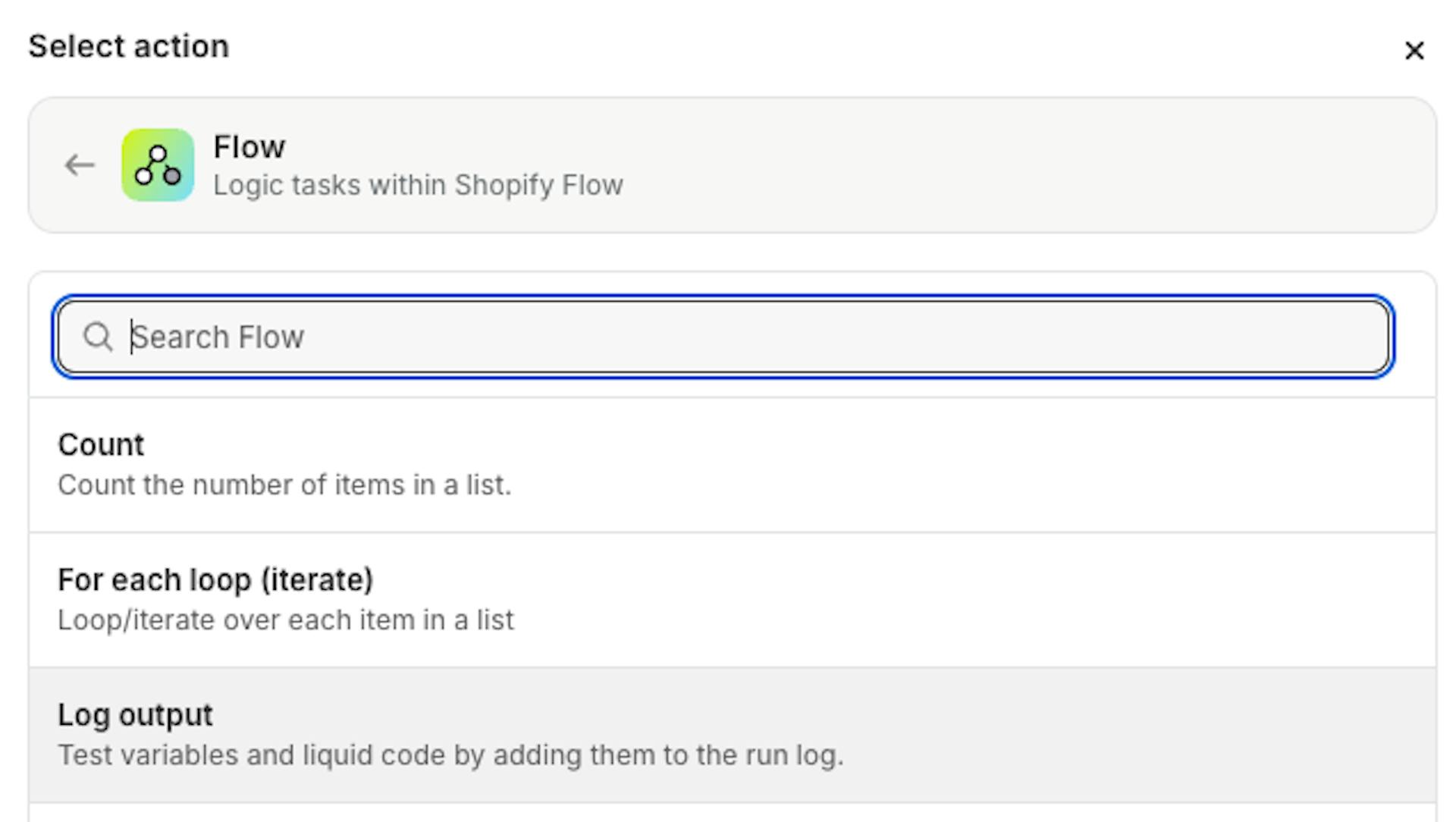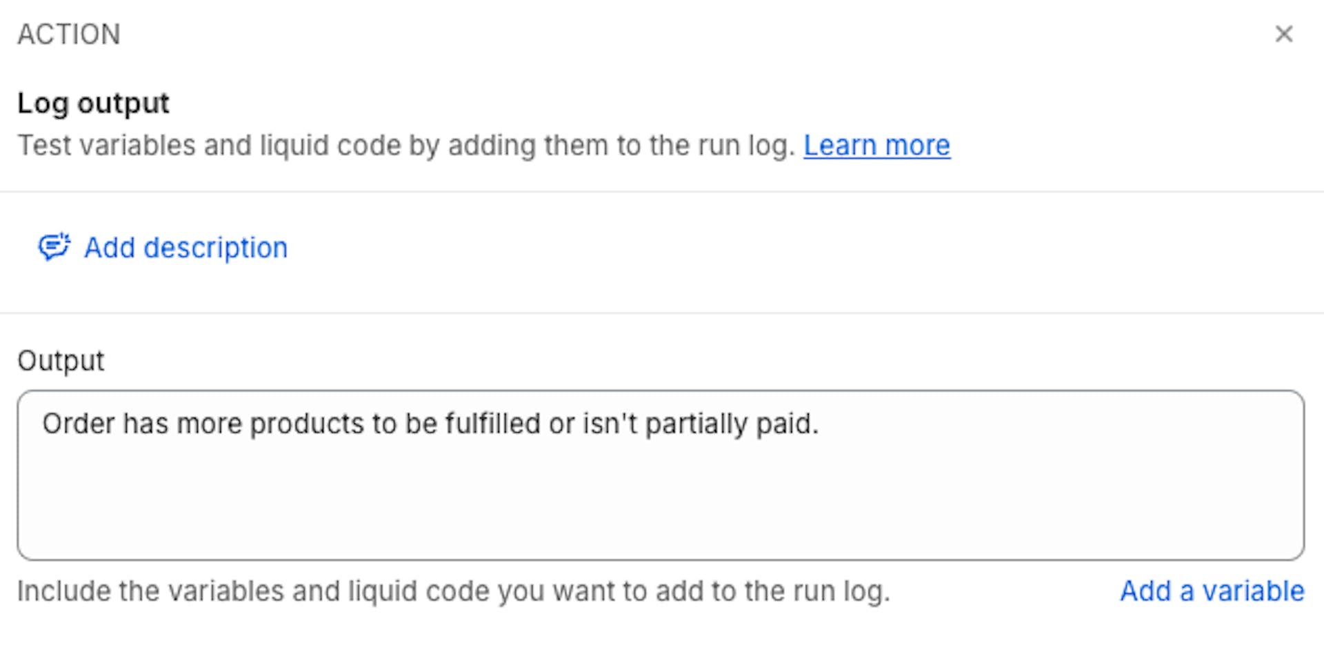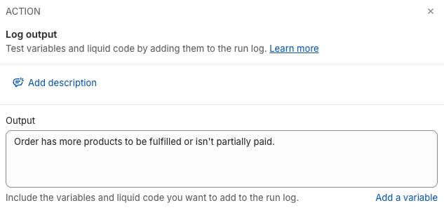 Our final action will be a simple Log Output which will just log a note for us when payment collection was not processed on orders that didn't meet our conditions.