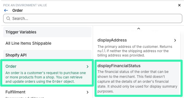 3. Navigate to the the Shopify API menu under Order and select displayFinancialStatus.