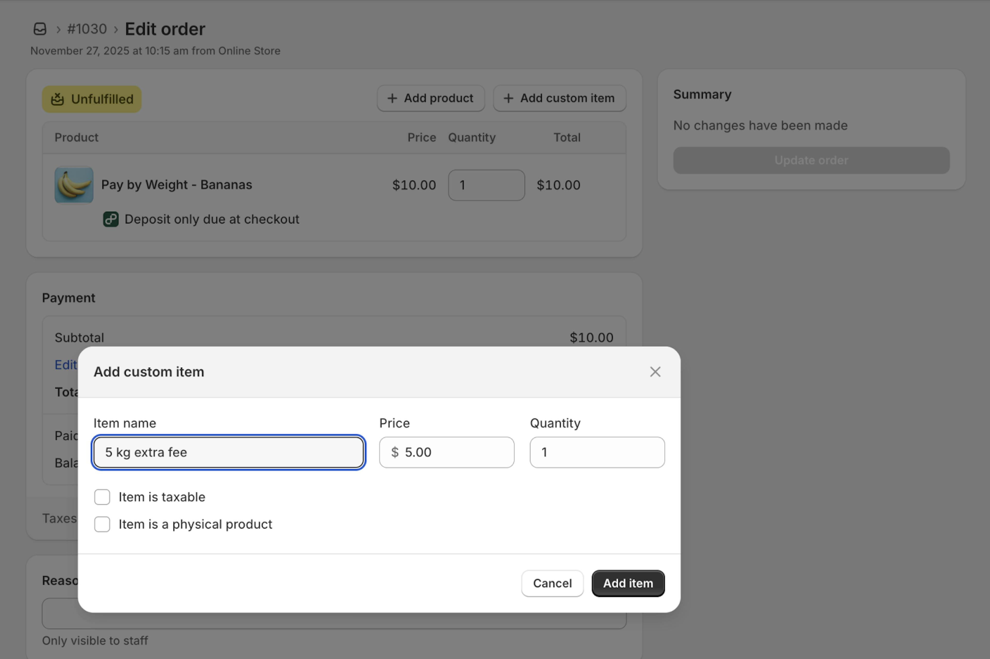 - At checkout, the customer pays the deposit amount and awaits any adjustment at fulfillment.
